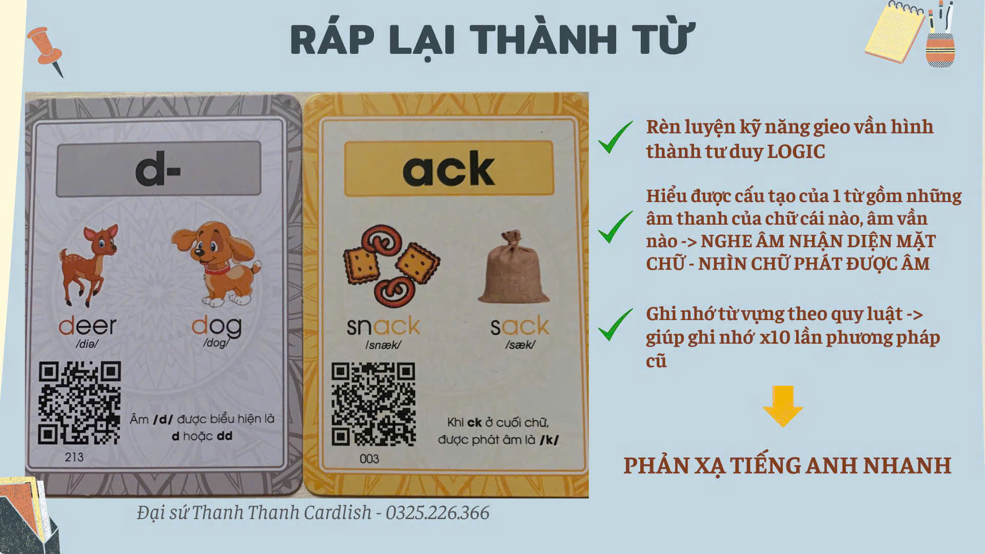 * Cardlish ưu việt sâu hơn: dack = d+ vần ack → vần ack xuất hiện nhiều từ khác như snack, tack, pack, back, track, crack,….